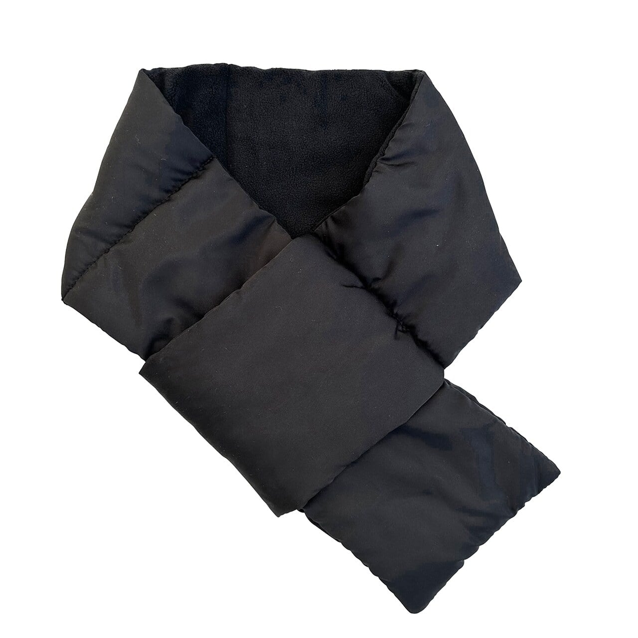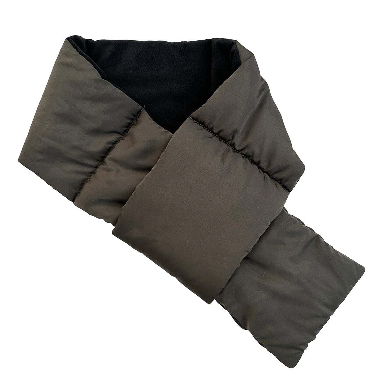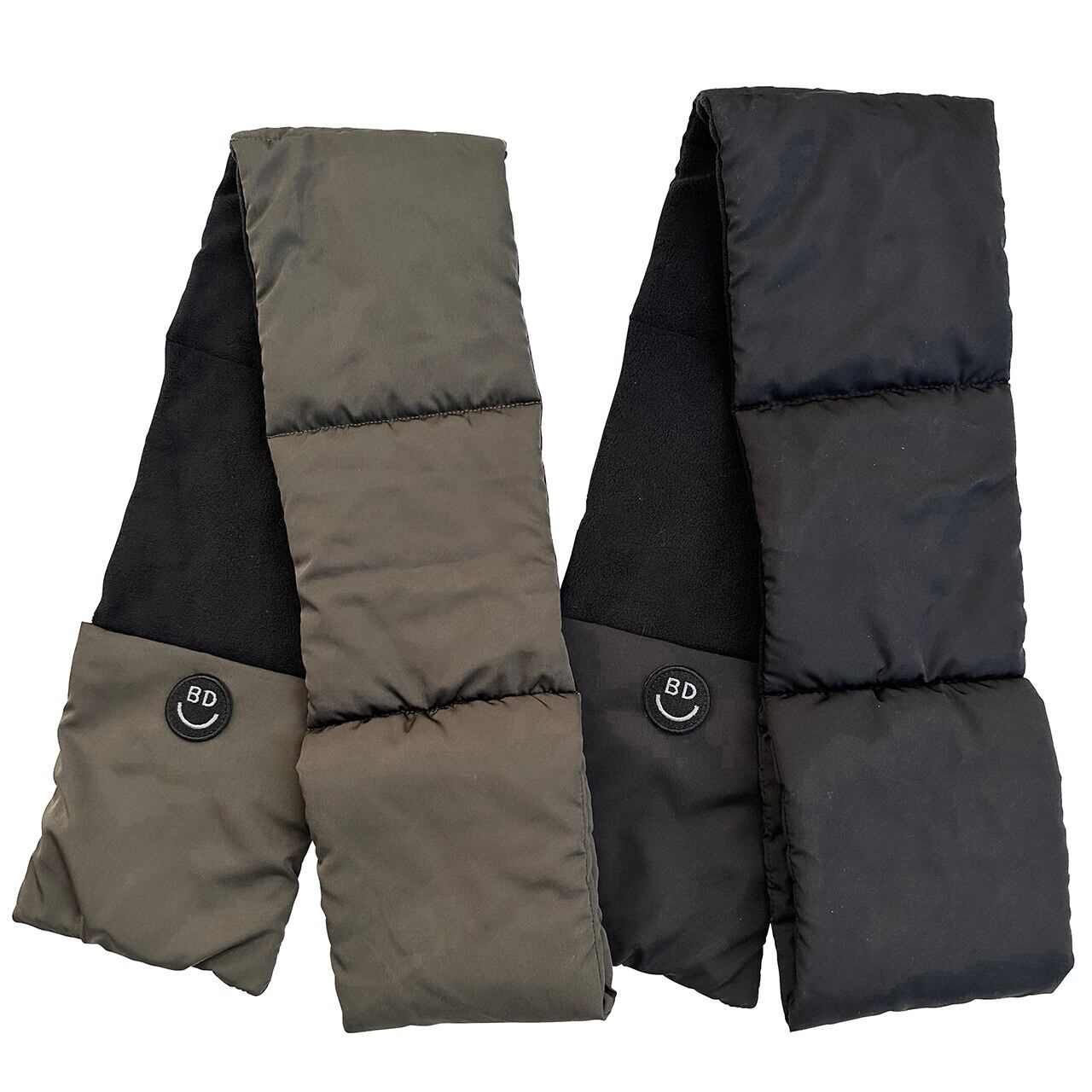 暖かい中綿入りのマフラー、着用時は、首に巻いて端のループにもう片方を通すだけ、